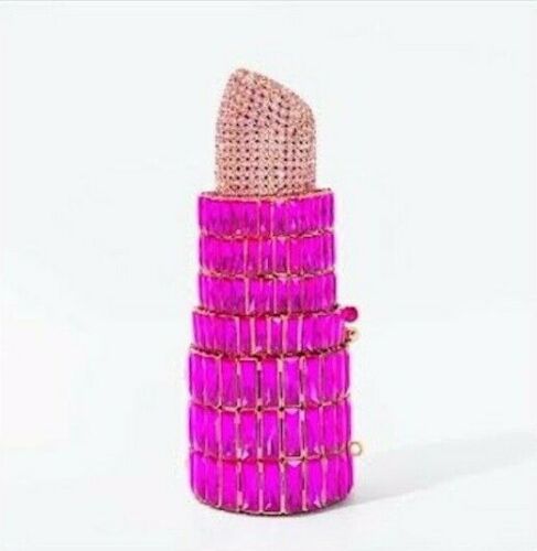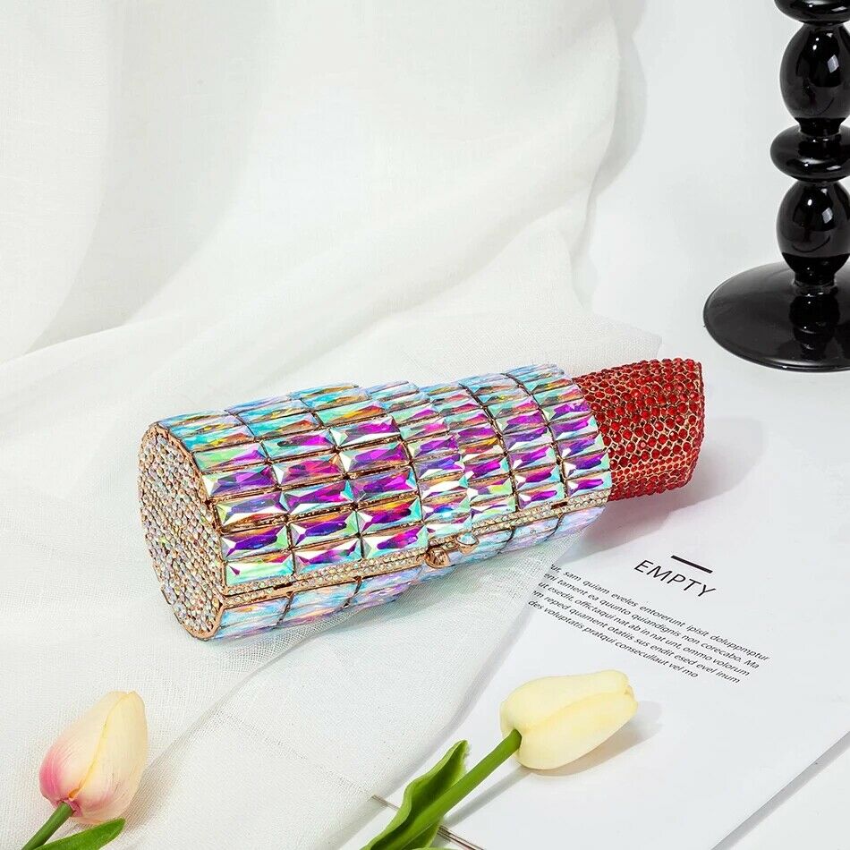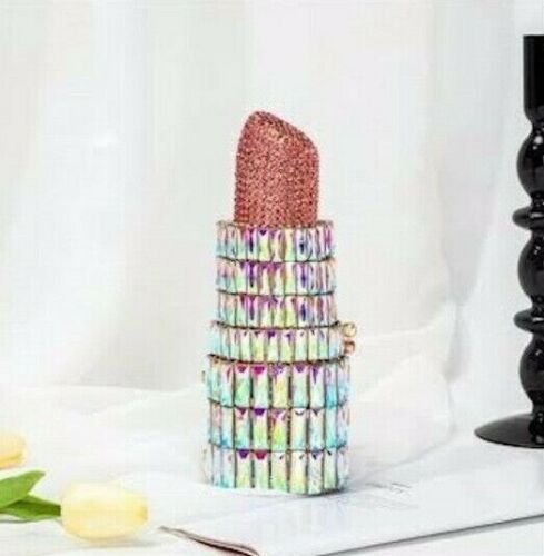 A absolute showpiece , perfect for your handbag collection. A small lipstick shaped crystal clutch , with beautiful crystal design and great contrasting colors. With a push lock . Lined inner material. Please look at dimensions so you are aware of the size. Does not fit cell phone.