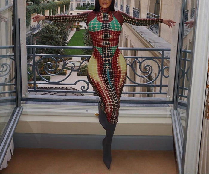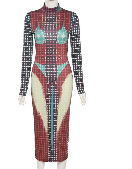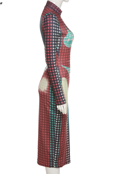 Kim Kardashian style printed midi dress printed stretch graphic print mock neck dress
